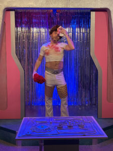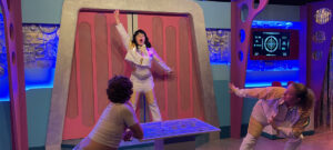 Set and costume designer Andrew Rodriguez-Triana has created a sleek, high-tech playing space. It immediately suggests science fiction. Sliding doors, a toy-like robot, video screens, and machinery-like devices signal the futuristic world. Meanwhile, tinsel-strip curtains add a festive, slightly campy vibe. Together, the design combines sophistication with playfulness. It prepares audiences for a colorful, upbeat ride.