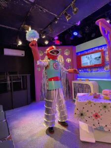 Finally, colorful and offbeat costumes by Rodriguez-Triana and Cindy Pearce enhance the play’s oddness. The outfits reinforce the show’s campy, fantastical, and delightfully unpredictable tone. In particular, drawings of robots appearing on a real-life robot’s “breasts” are funny and memorable.