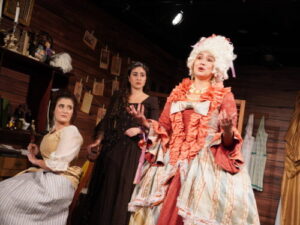 Similarly, over the centuries, society has overlooked women’s stories in favor of male-dominated narratives. Indeed, there’s a sense that women’s history, like the statue in the set, is fractured; women are there, but not whole, not seen clearly. But women are unmissable in The Revolutionists. MSP’s believable production is a spirited celebration of female resilience and the tight bonds of sisterhood—even amid the specter of the scaffold.