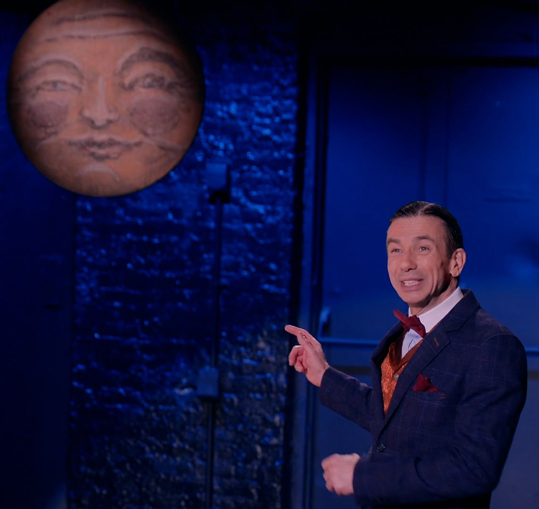 For the purposes of the abridged film version of George M. Cohan Tonight!, a film crew captured the show on location at The 13th St. Repertory Theatre in New York City. There is little scenic design. However, we often watch Peterson next to sights such as a billboard with Cohan’s full name in lights, as well as a moon sporting a peaceful face, or, as Cohan sings, “that good old musical moon.”