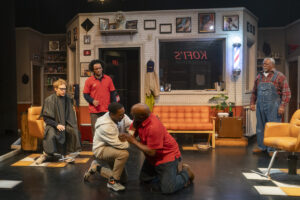Except customers aren’t coming in often these days, and that’s a problem for the barbershop’s future. But as the play opens, attention must be paid to the untimely passing of a local legend. Kofi and his lone employee, Sweep (Nathan Barlow), raise a toast to a legend of the local Black community.
