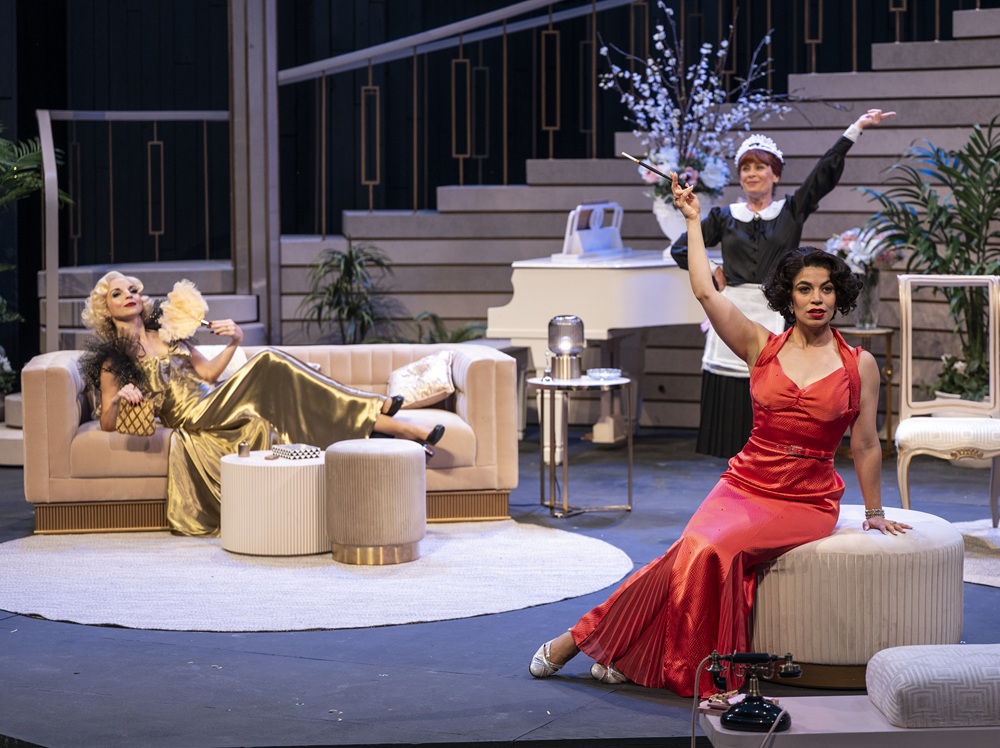 The play is set in a living room (with a grand winding staircase to the front door). Everything exudes opulence in shades of cream (including the baby grand piano) and gold. In perfect harmony with Scott Penner’s set is the enchanting lighting by Dawn Chang. Tall pillars in the dining room are topped with Art Deco-designed lighting fixtures. Again, the setting is primed for sleek sophistication, wit and over-the-top drama. Shannon Cochran directs.