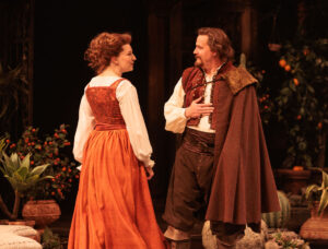 Sometimes, those echoes are obvious. An actor appearing as a lead in one play may show up as a supporting player in another. And it’s difficult not to draw comparisons. Jordan Hall’s lovestruck king in Love’s Labour’s Lost, for instance, takes on a more serious air as Bolingbrook in Richard II, yet both performances make clear each character’s inner conflicts. The new script for Richard II borrows lines from Lear, which you may be more likely to notice if you see them in the opposite order. Hero’s awakening in Much Ado About Nothing echoes Mimi’s revival in Rent – and either may trigger memories of the “not dead yet” number in Monty Python’s ‘Spamalot.’